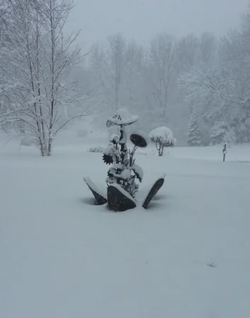 I picked up these plow boards from a dairy barn that was being dismantled in St. Albans, Mo. in the 1980s. Years later, these metal petals gave rise to this multi-bloom perennial that weathers every season. Other flower parts include gears, ball bearings and the steering column of a model T car.